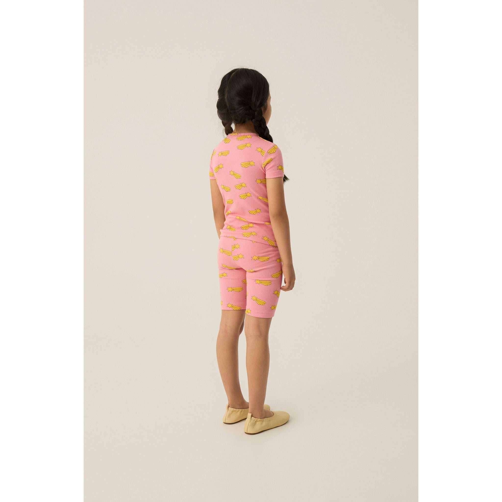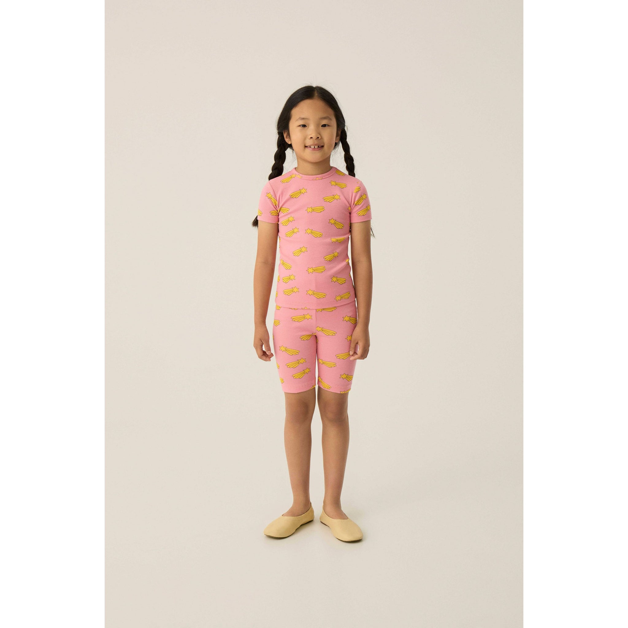 The Campamento pink bike shorts with all over shooting star print in yellow from the new SS26 collection 'Volver'