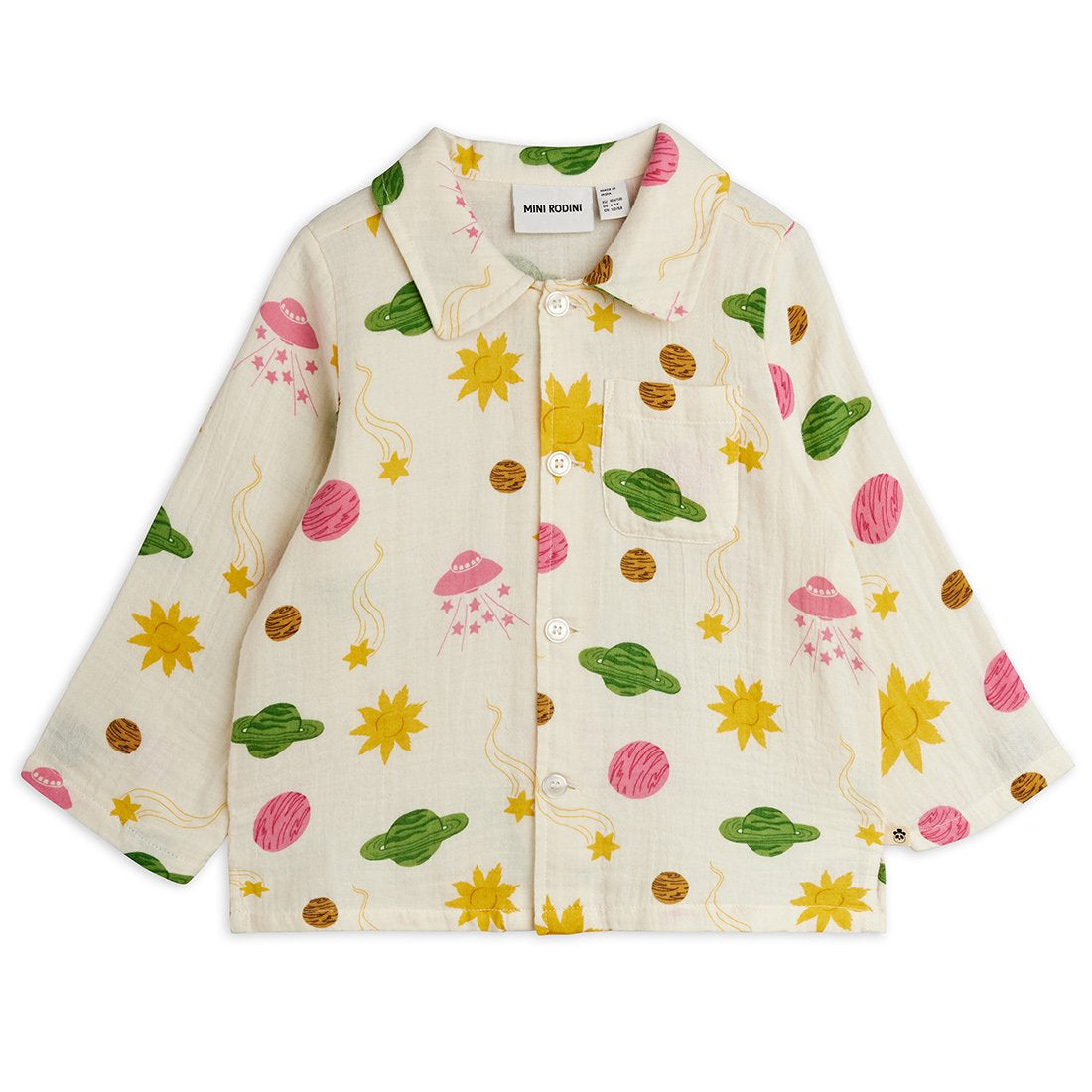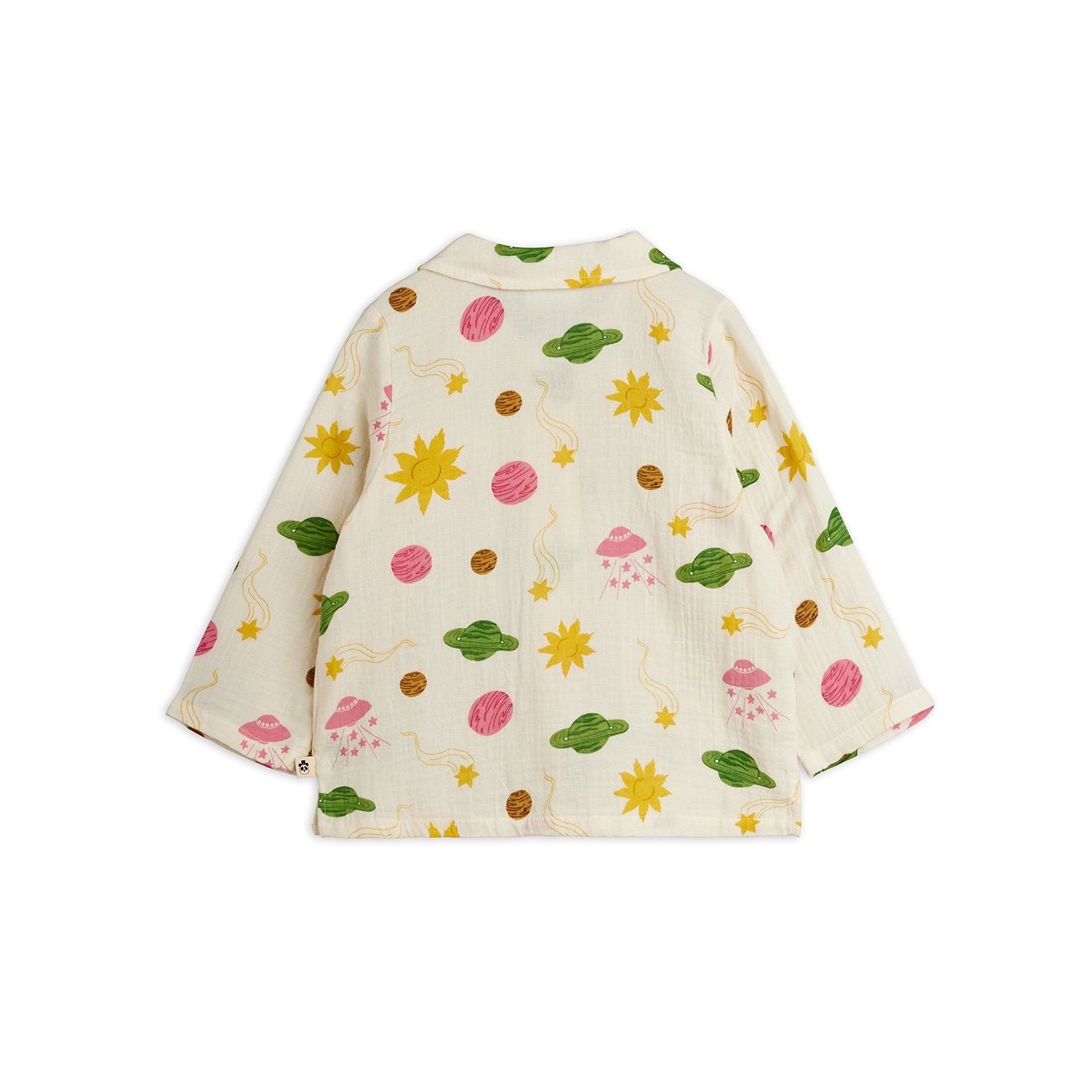 Mini Rodini cream muslin shirt with all over space design in pink, green and yellow from the new SS26 collection 'Alien Affairs'