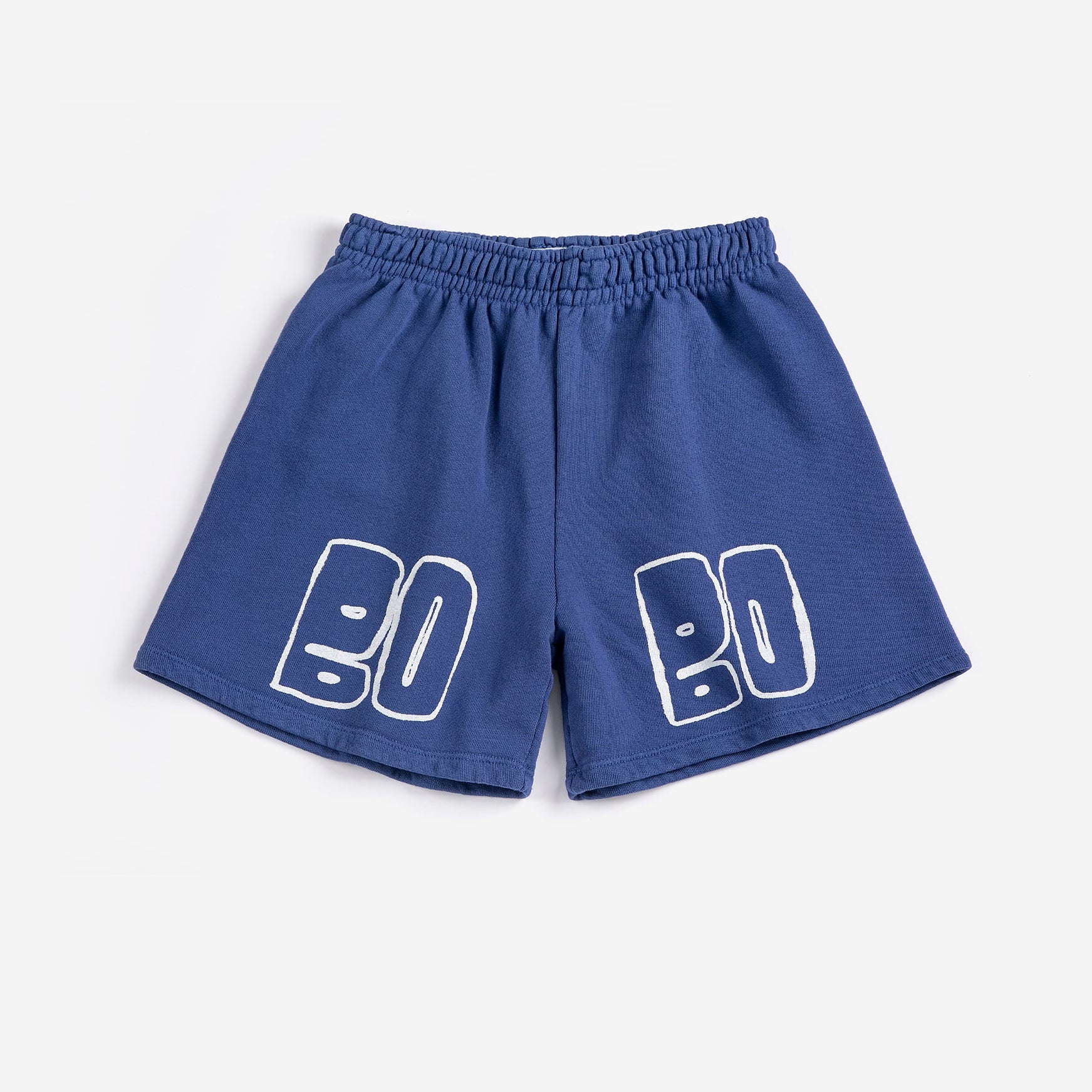 Bobo Choses navy blue Bermuda style shorts with Bobo logo in white from the new SS26 collection 'Pickles'