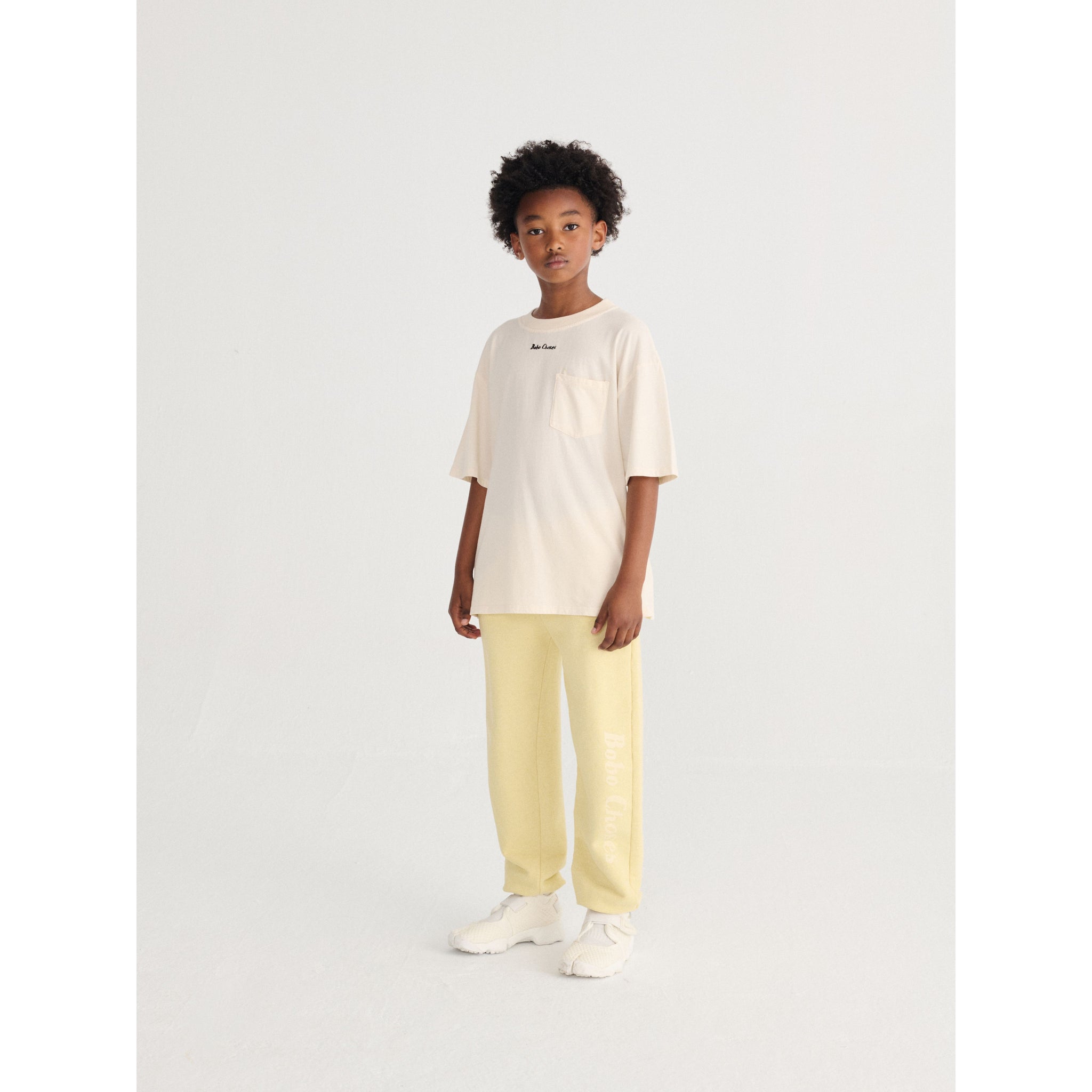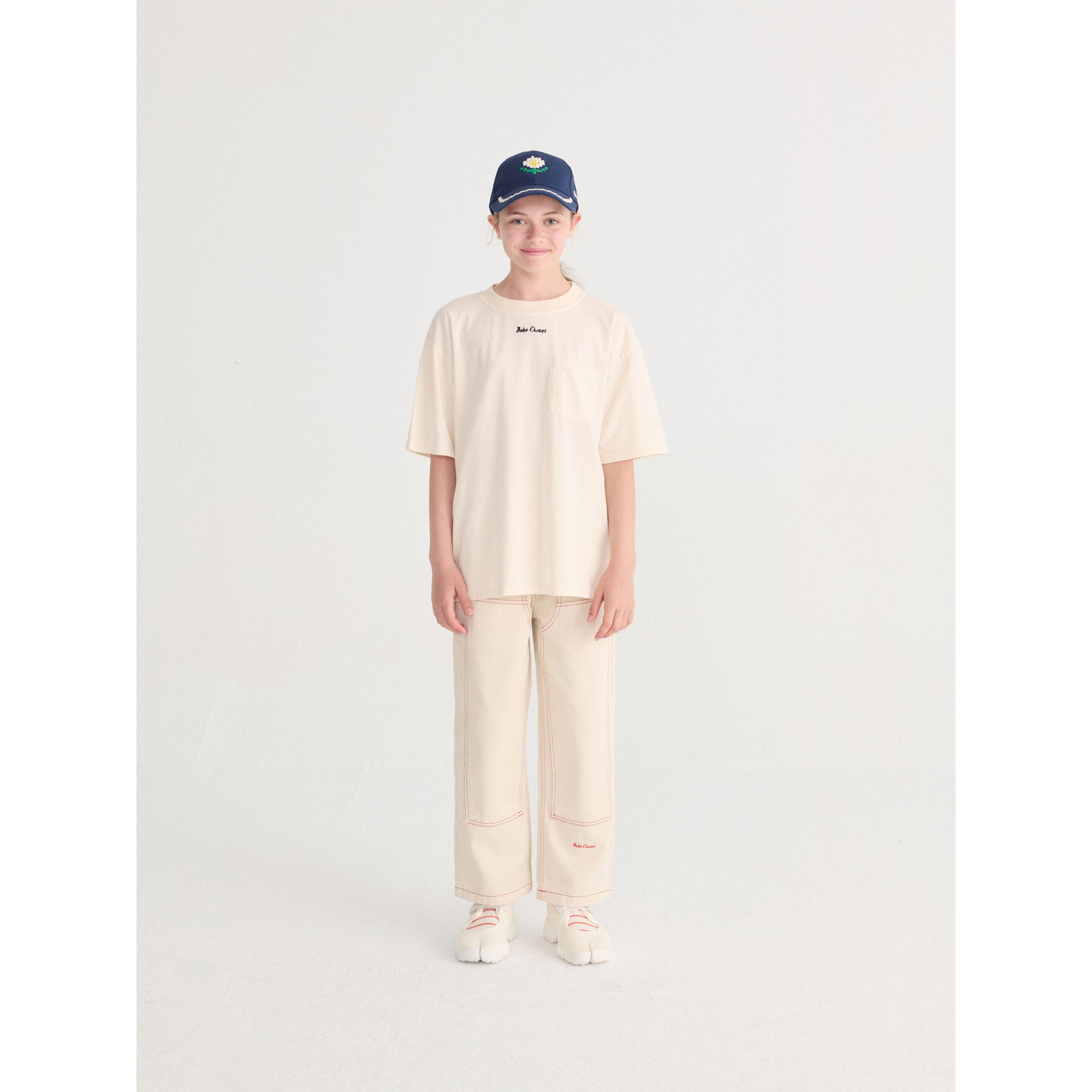 Bobo Choses cream oversize t-shirt with radish print in purple on the back and black embroidered logo on the front from the new SS26 collection 'Pickles'