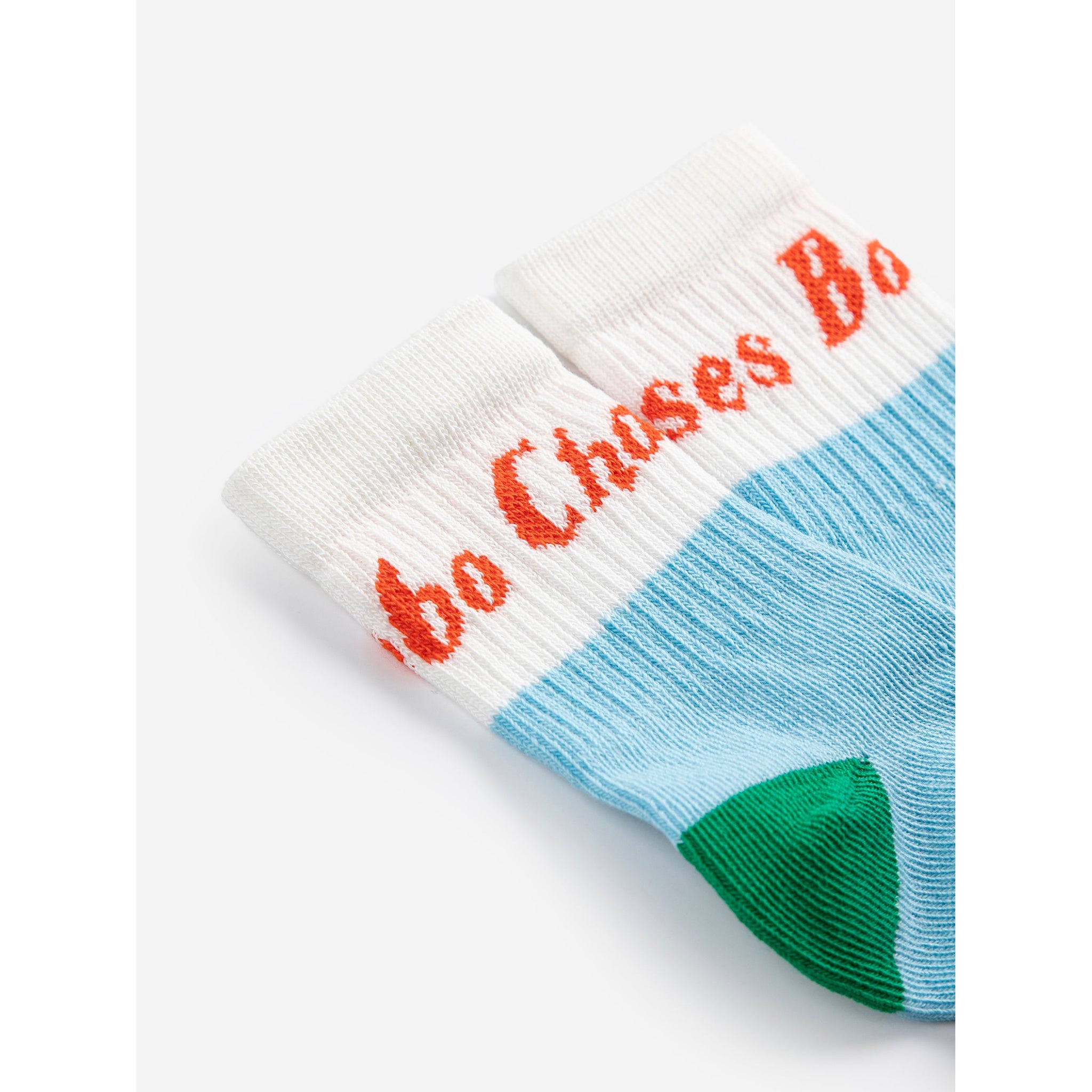 Bobo Choses blue and green baby socks with white trim and red logo from the new SS26 collection 'Pickles'