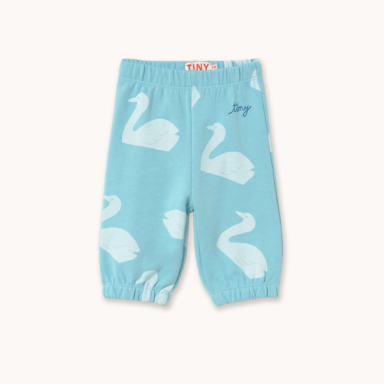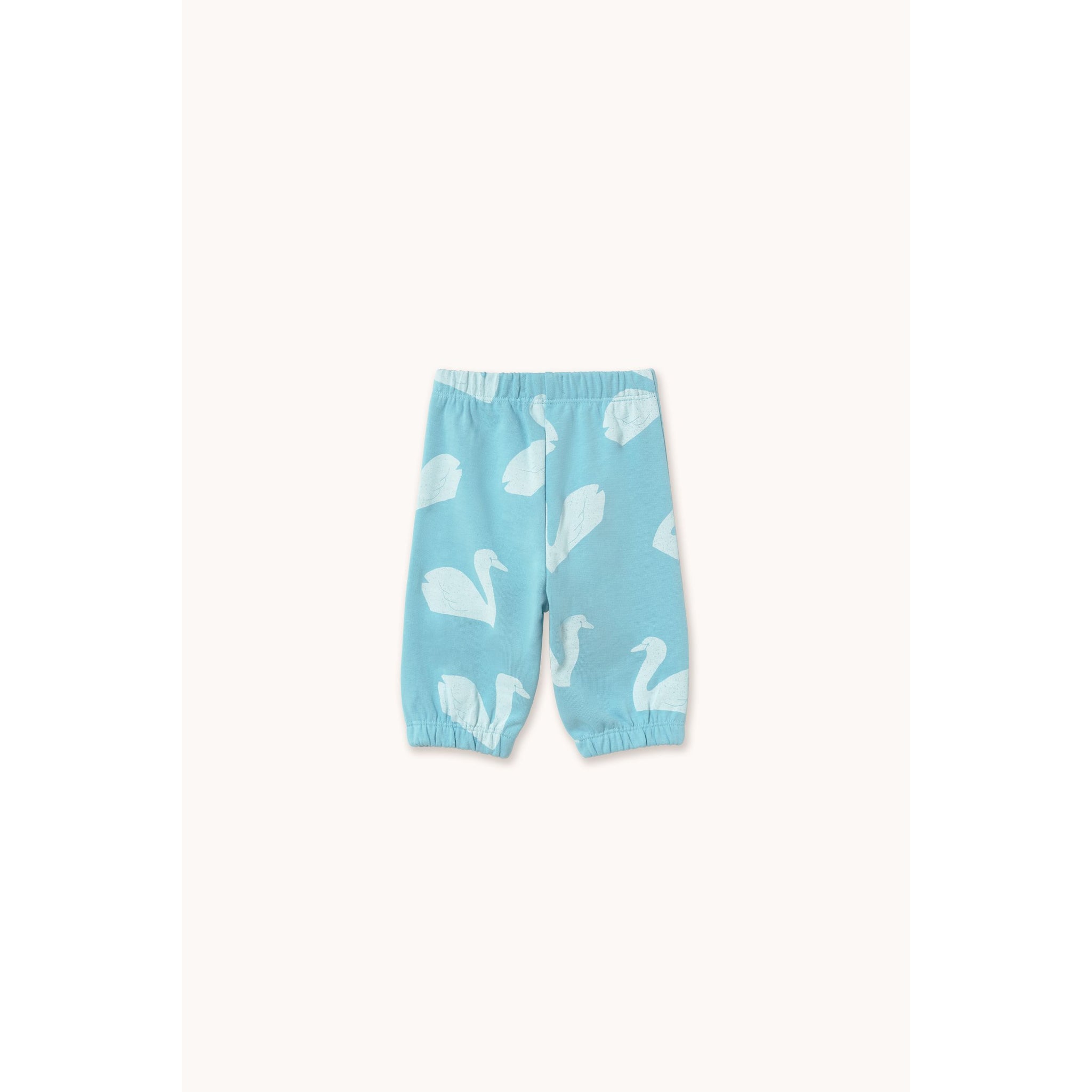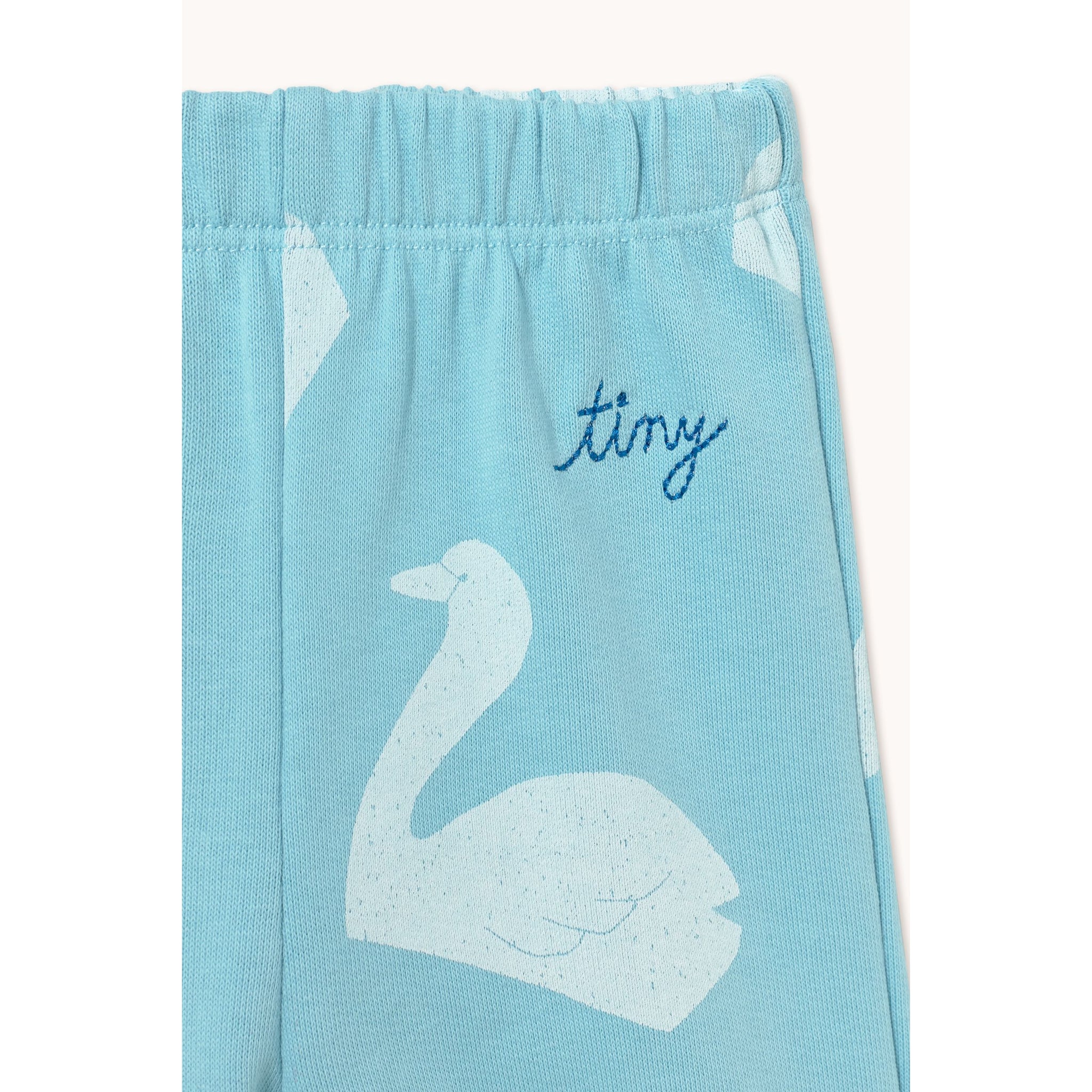 Tinycottons cyan blue baby trousers with all over swan print in white from the new SS26 collection 'Giverny'
