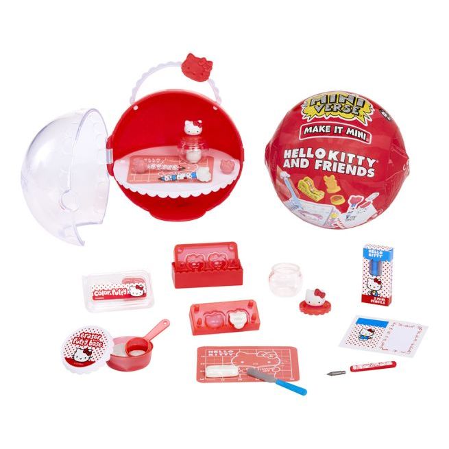 Each ball comes with realistic mini items to make your own mini replicas of your favourite Sanrio themed stationary items, including mini erasers and notebooks. Each package is a SURPRISE, so you won't know which mini you have until you unbox it! There are 8 different Hello Kitty and Friends minis to collect in this fabulous mini retro stationary edition.