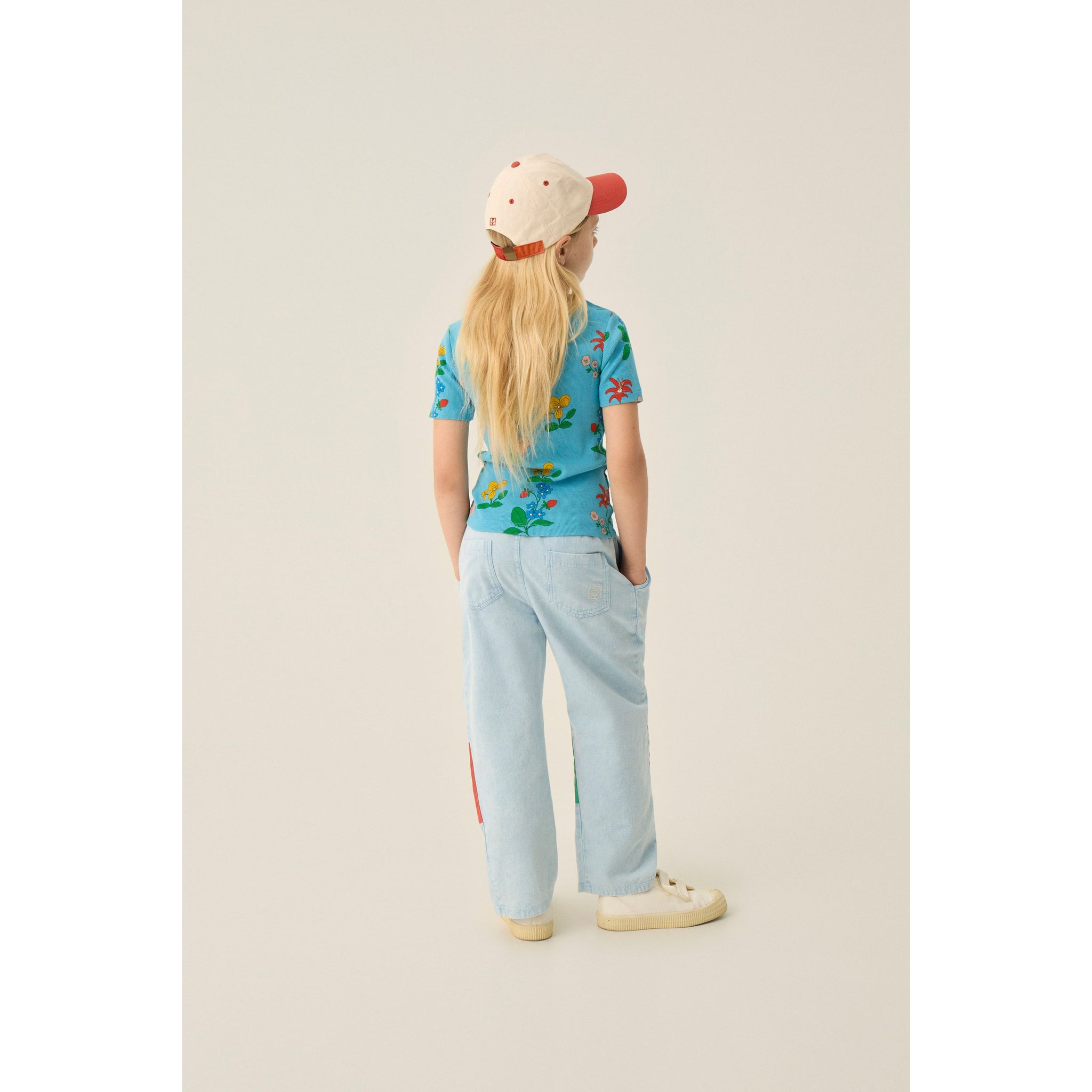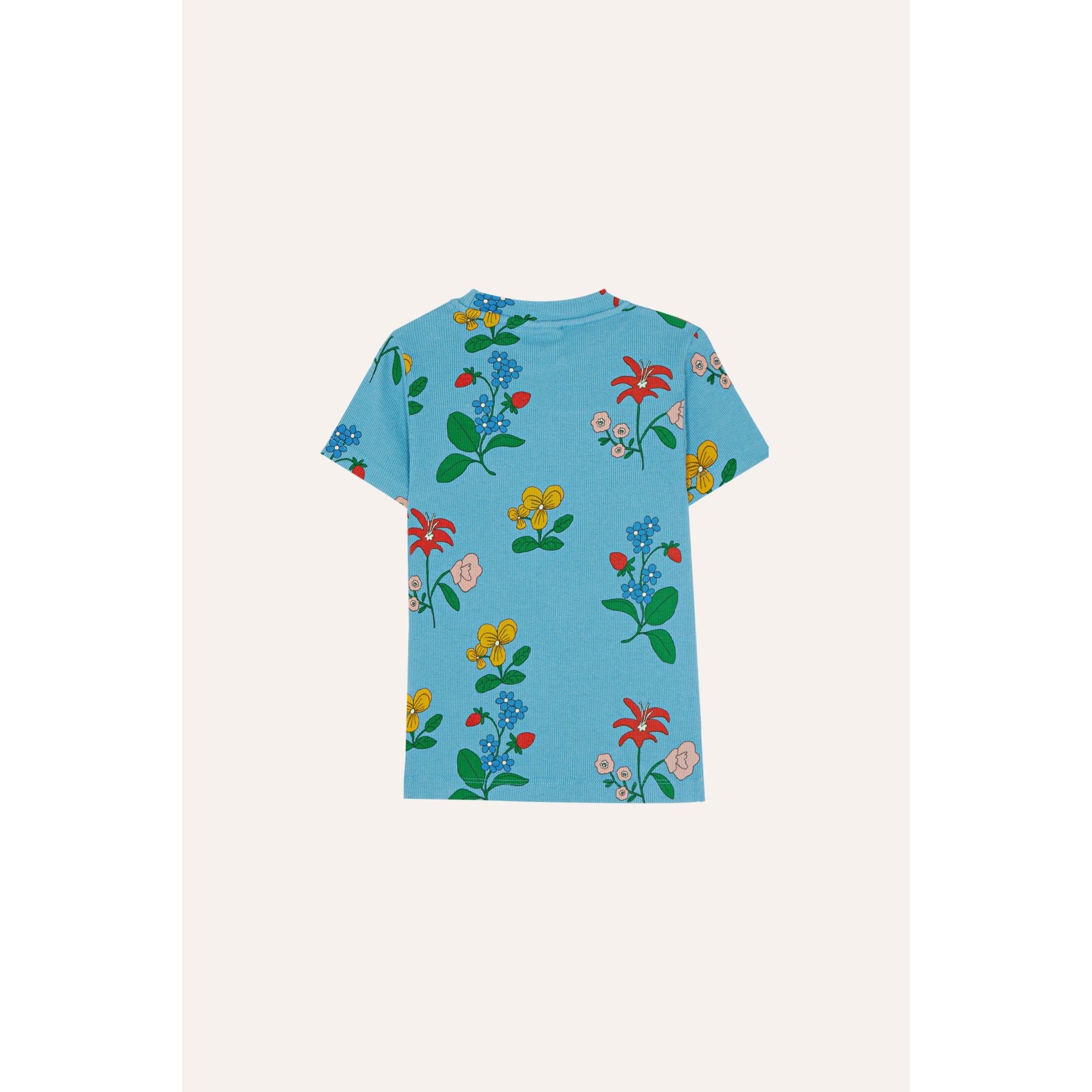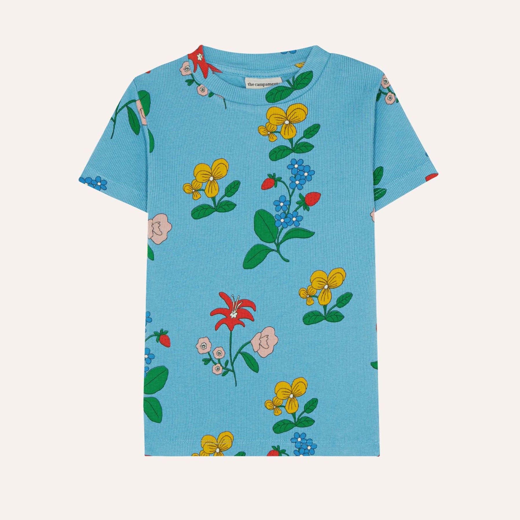 The Campamento blue t-shirt with all over flower print in yellow, red and green from the new SS26 collection 'Volver'