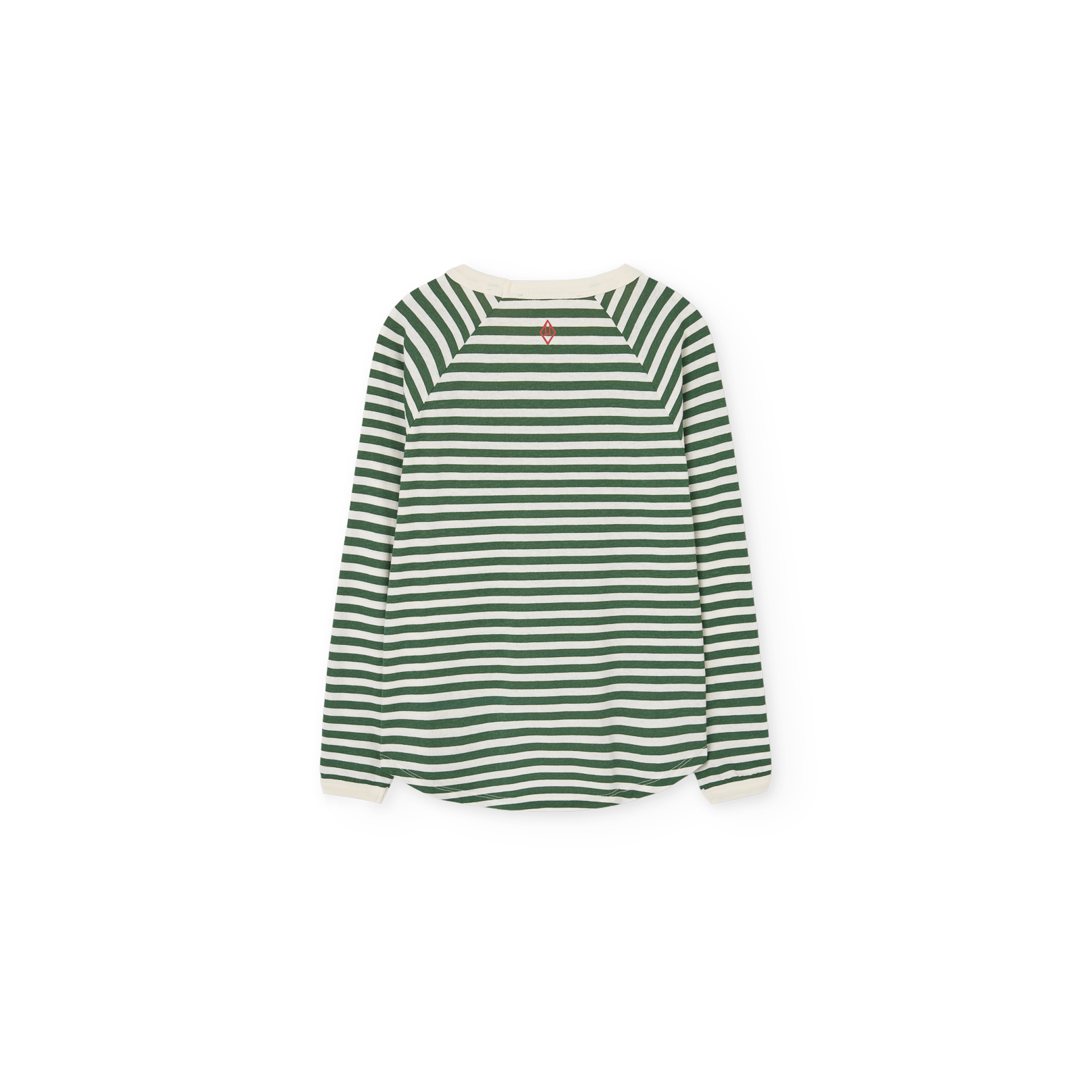 The Animals Observatory green and white stripe long sleeve t-shirt with red logo print from the new SS26 collection.